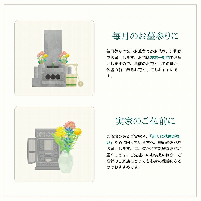 毎月のご命日に合わせて、季節のお花をお届けします。ご家族にとって大切なご命日に、季節のご挨拶もかねて、お供えのお花をお届けします。