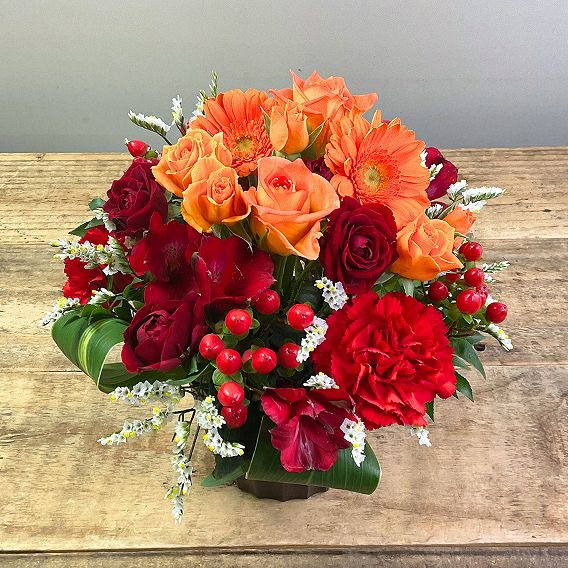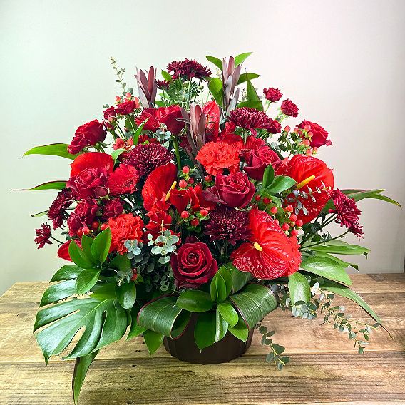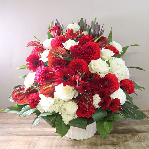 企業や会社に送るお祝い花は胡蝶蘭の花鉢が一般的ですが、一方で、胡蝶蘭にも負けない大きなアレンジメントも人気があります。お祝いの定番である胡蝶蘭よりも、色が鮮やかなのは生花ならではの魅力。一般的なコチョウランが並ぶ中に華やかなアレンジメントがあるだけで、目を引きインパクトは抜群です。