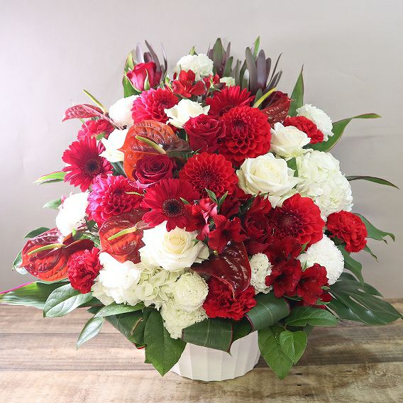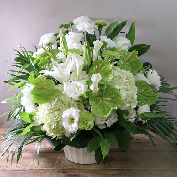主要取引先・上場企業等: 目安予算 ¥30,000〜¥50,000。2L〜5Lサイズ、胡蝶蘭・大型アレンジで厳かな印象に。