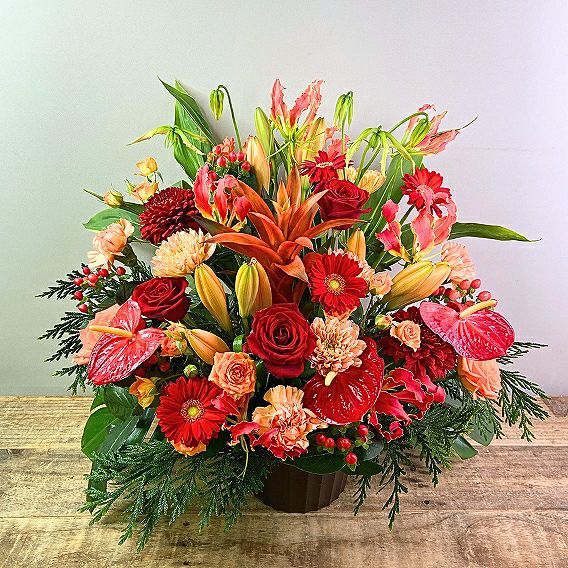 主要取引先・上場企業等: 目安予算 ¥30,000〜¥50,000。2L〜5Lサイズ、胡蝶蘭・大型アレンジで厳かな印象に。