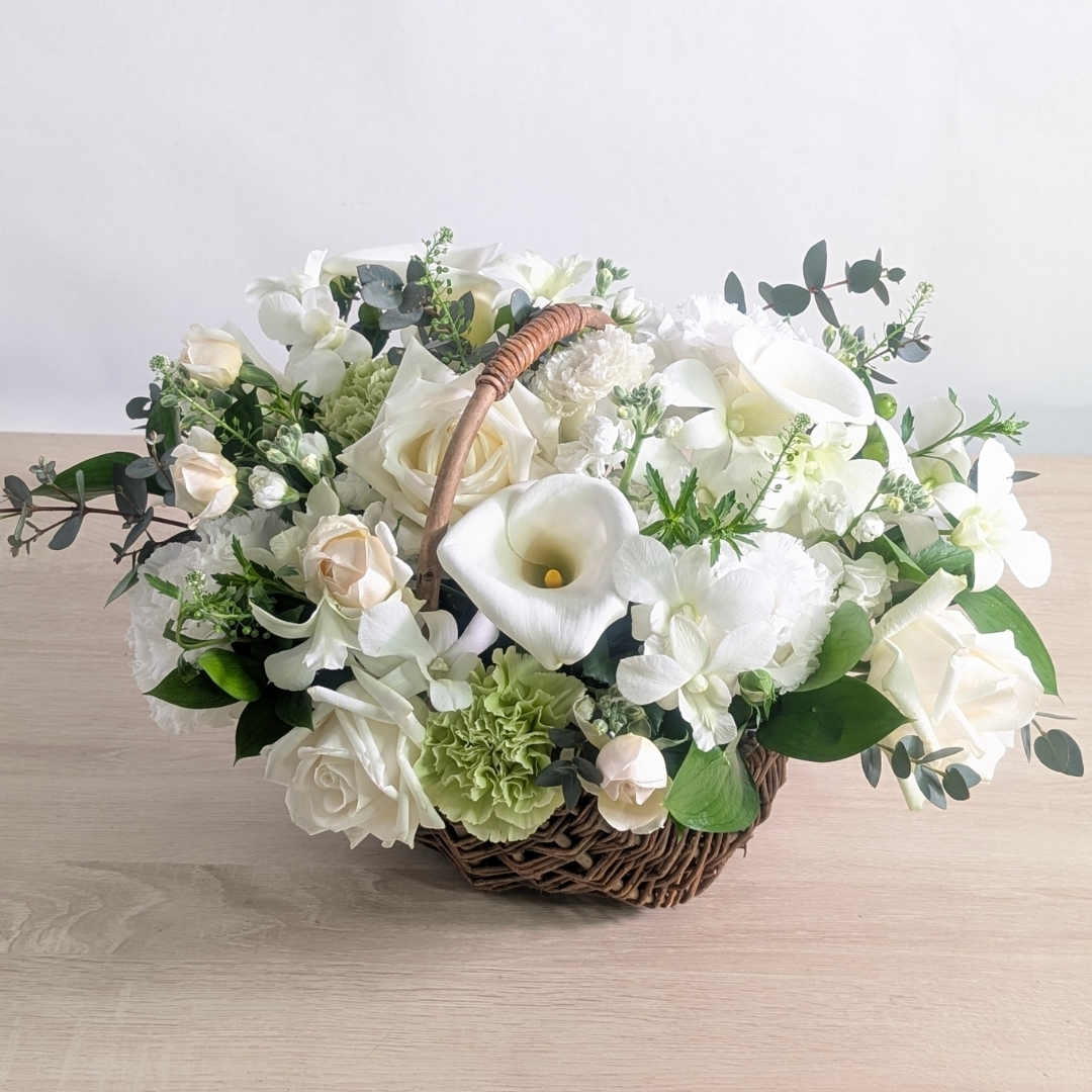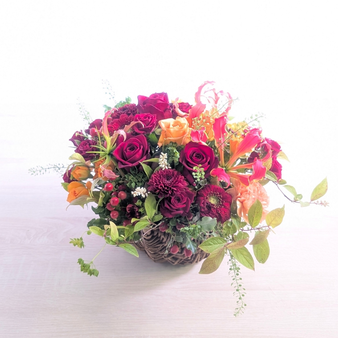 かごの質感と花々の彩りが、温かみのある雰囲気を生み出し、どんな方にも喜ばれる万能な贈り物です。