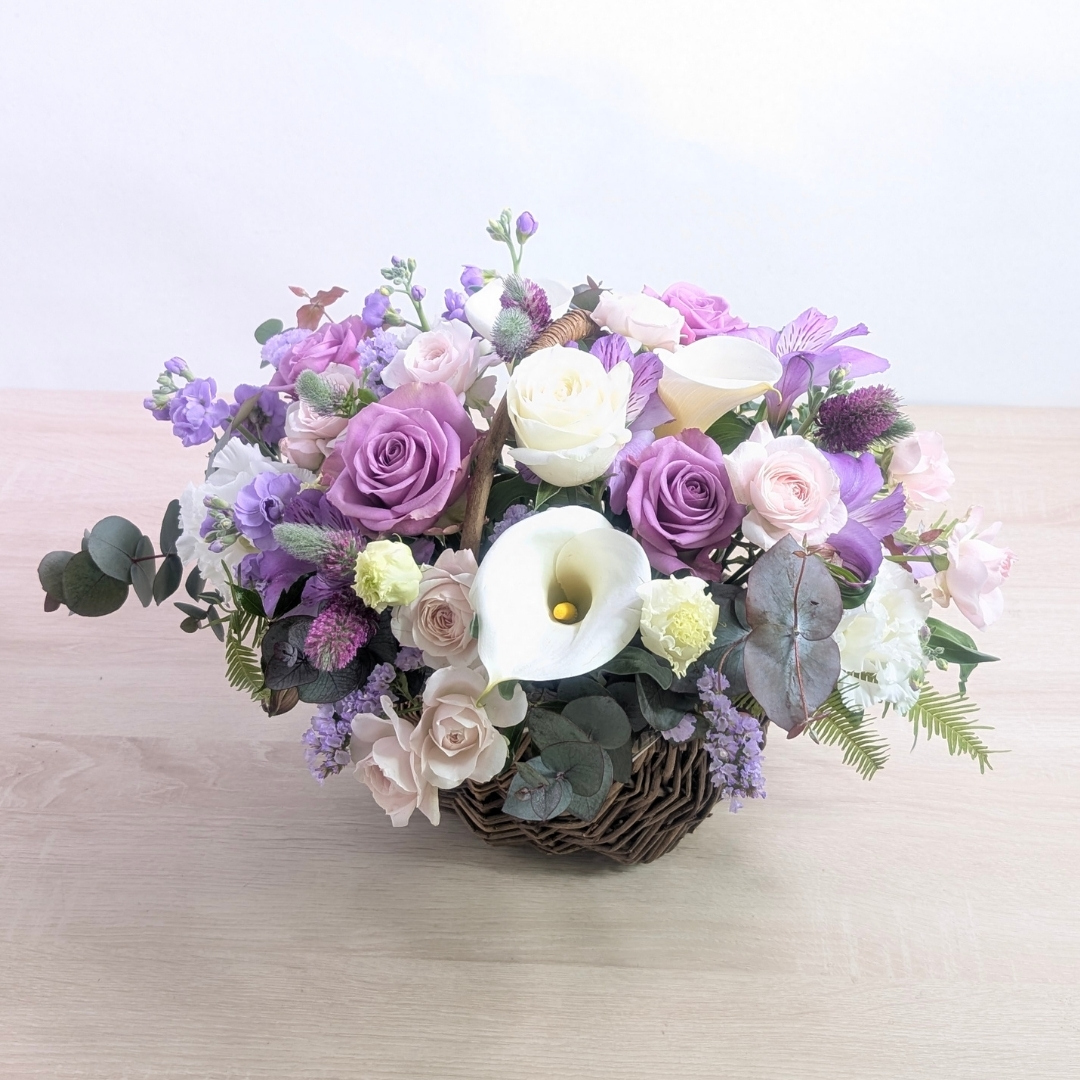 ナチュラルで上品な印象のフラワーバスケットは、誕生日や記念日などのプレゼントに人気のフラワーギフトです。