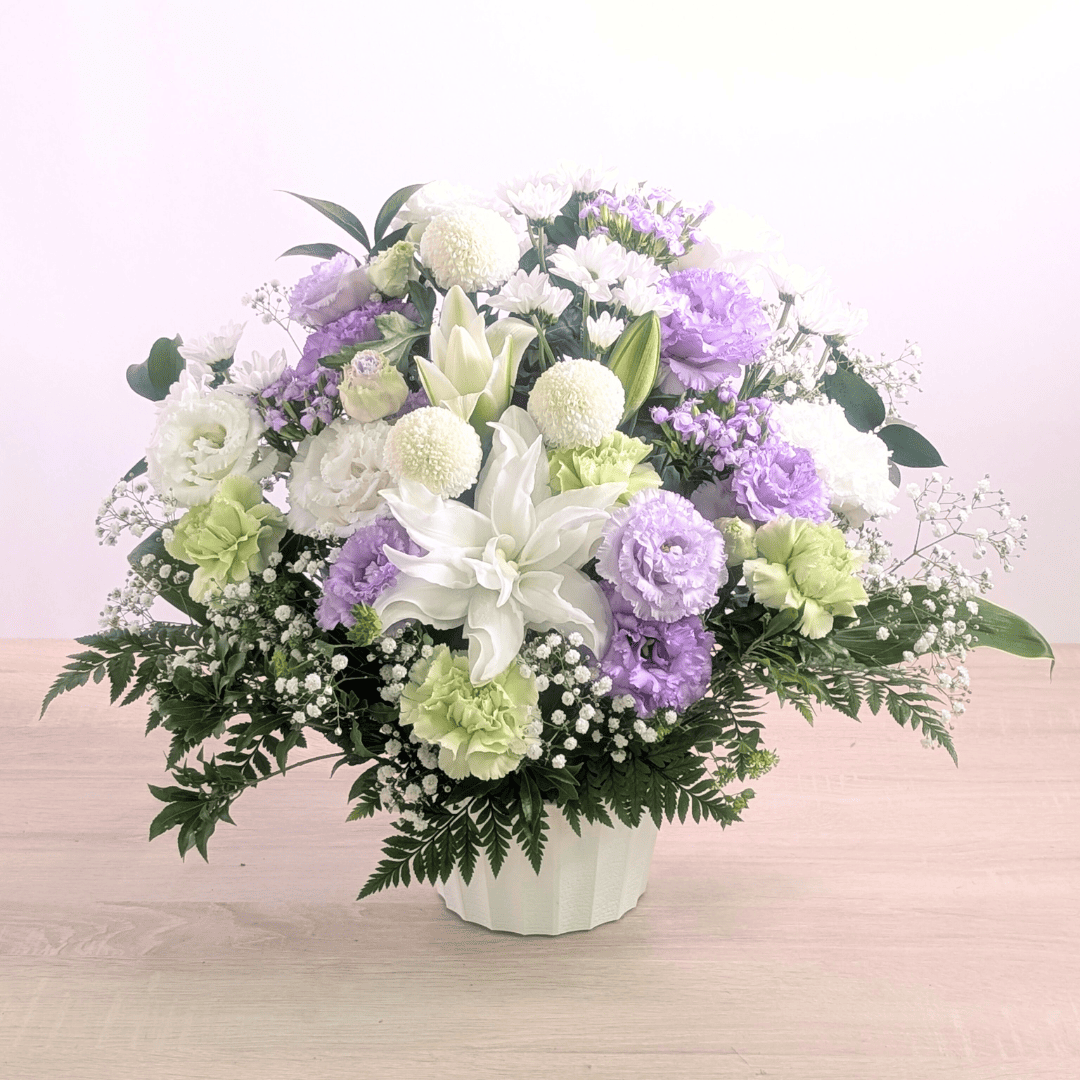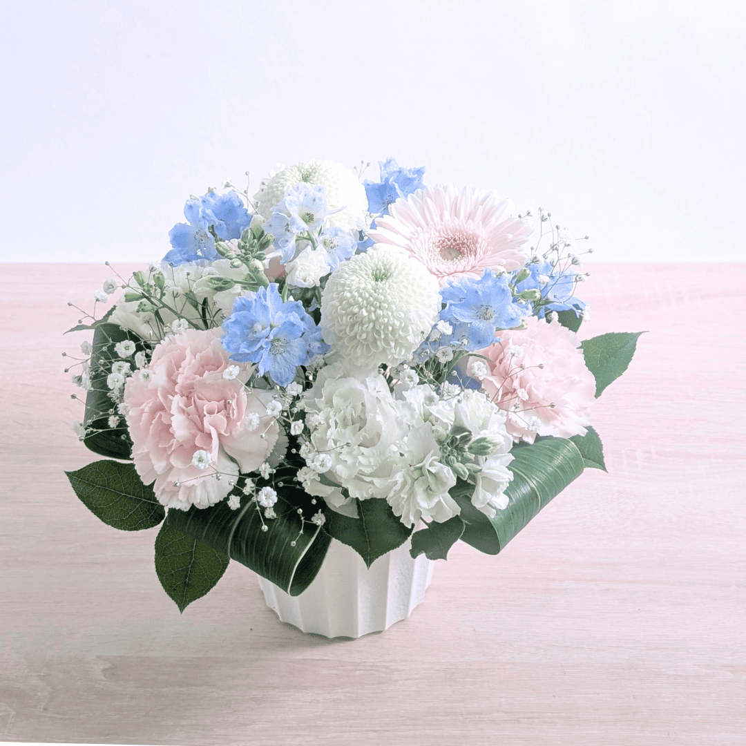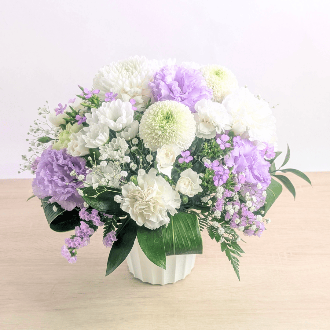 月命日は毎月の命日、祥月命日は年に一度の命日です。色は白〜淡色が基本で、白+グリーンはどのご家庭・宗派にも配慮しやすい無難な配色。 一周忌以降は淡い紫・水色・ピンクなど落ち着いた差し色も選ばれます。置きやすい低めアレンジや、花器不要の花束(そのまま飾れるタイプ)が実用的です。