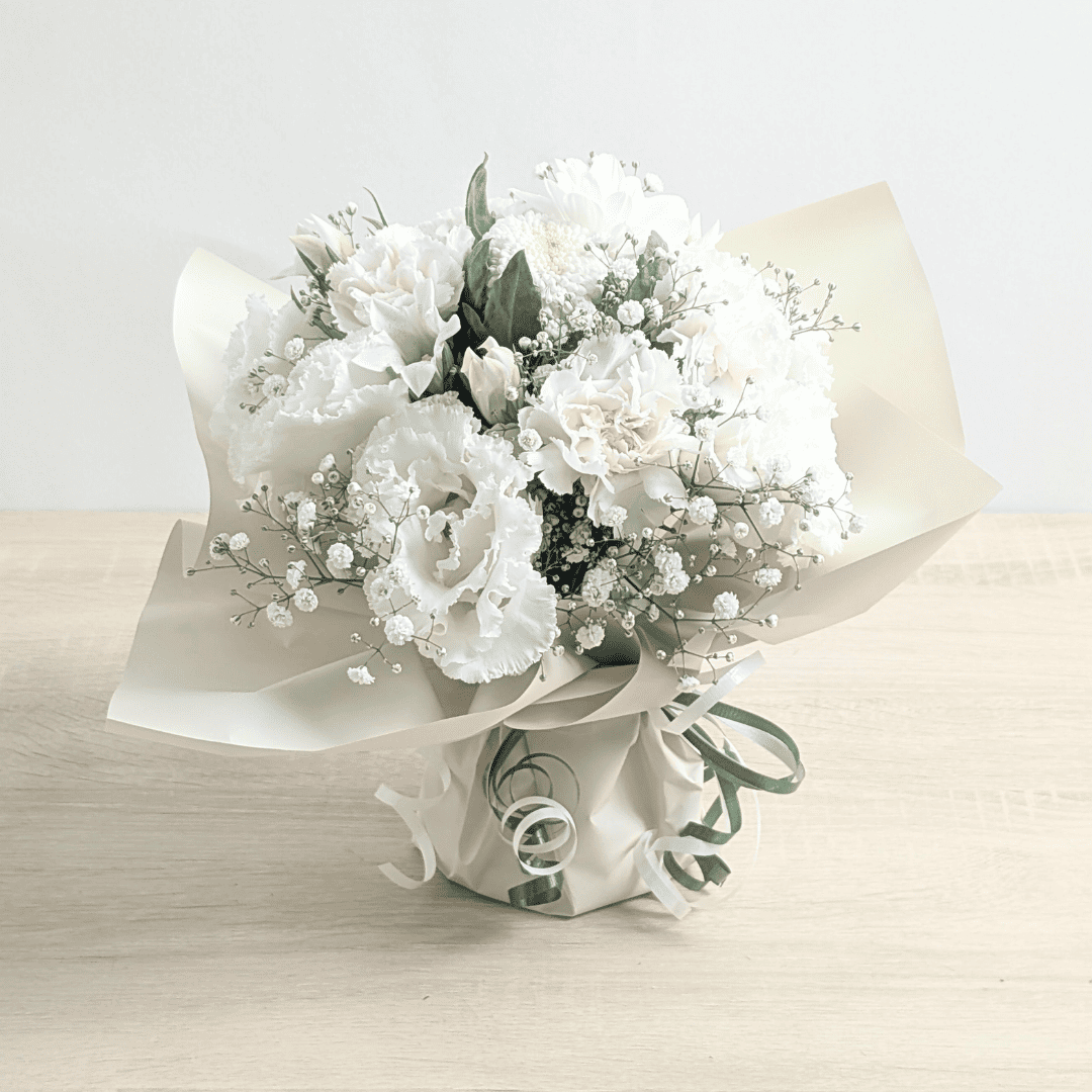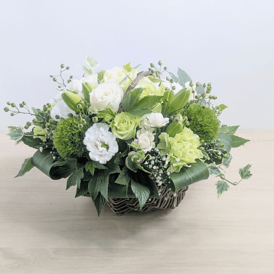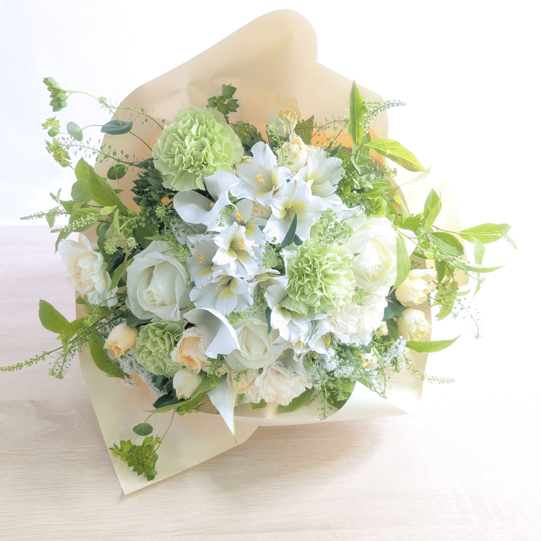 月命日は毎月の命日、祥月命日は年に一度の命日です。色は白〜淡色が基本で、白+グリーンはどのご家庭・宗派にも配慮しやすい無難な配色。 一周忌以降は淡い紫・水色・ピンクなど落ち着いた差し色も選ばれます。置きやすい低めアレンジや、花器不要の花束(そのまま飾れるタイプ)が実用的です。
