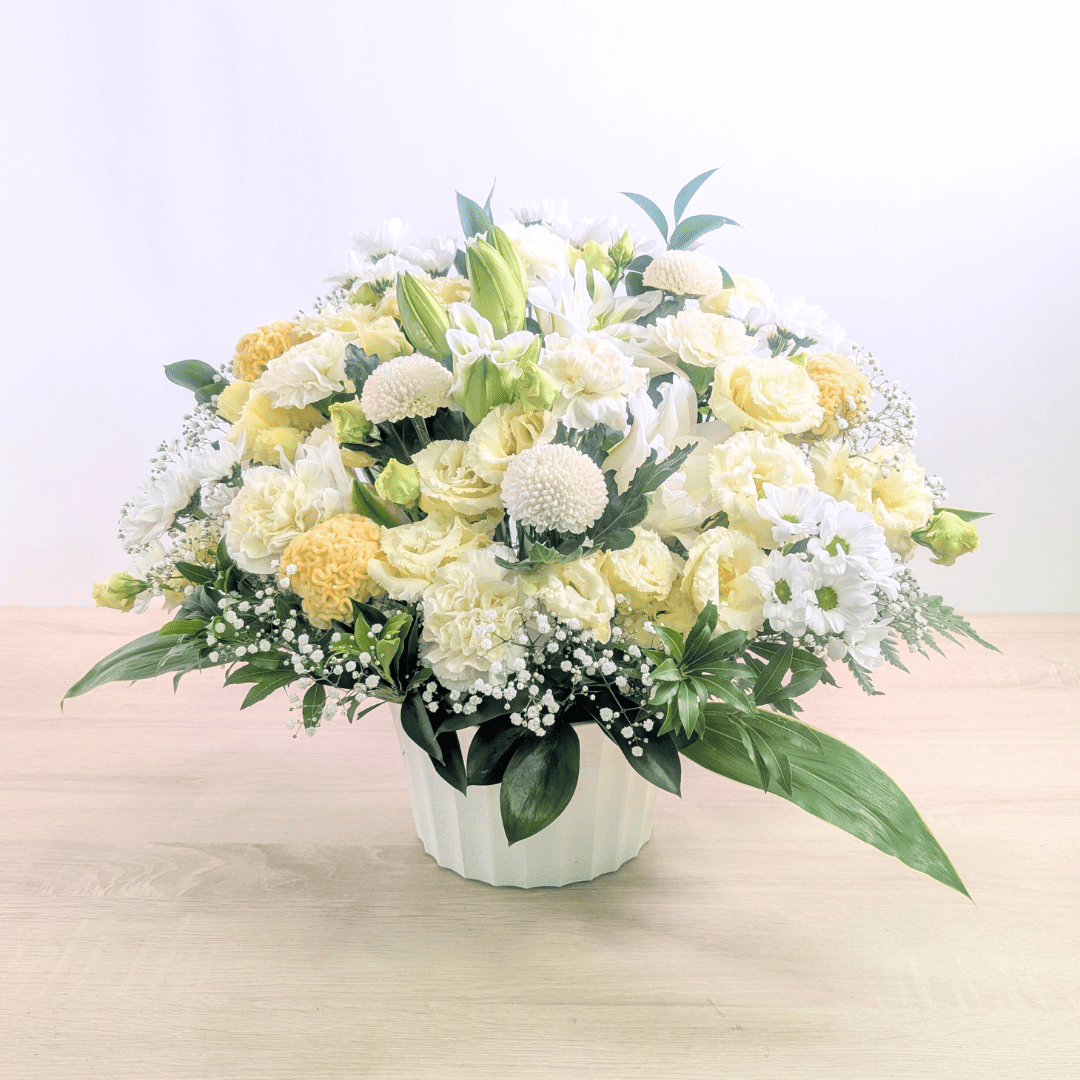 ご自宅やお仏壇へのお供えとして、白や淡い色を基調にした花束・アレンジメントを全国へお届けします。月命日は、故人を穏やかに偲び、日々の暮らしの中で想いを寄せる大切な日。清らかな花々が、祈りの空間をやさしく包み込みます。