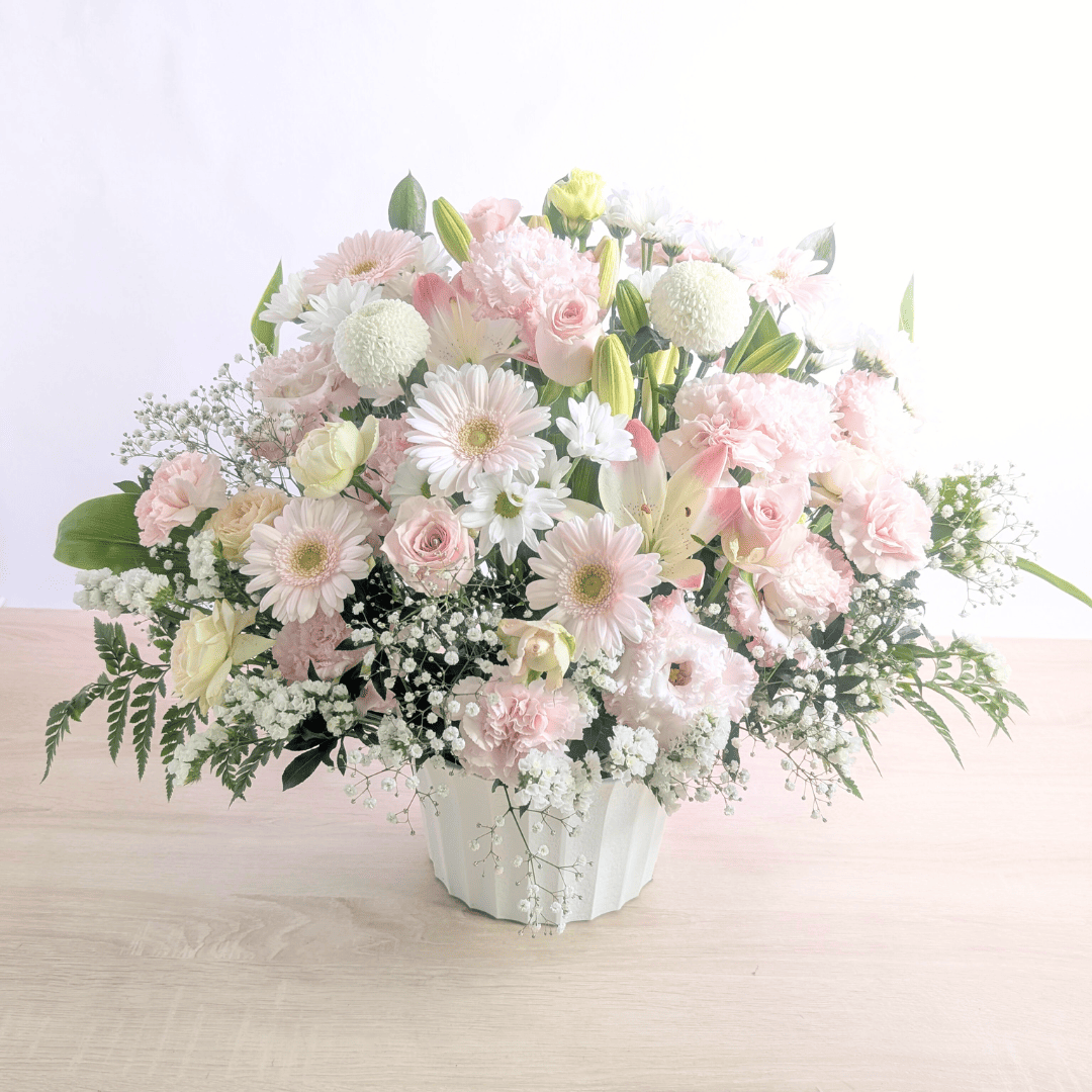 - 推奨花材:ユリ/トルコキキョウ/カーネーション/小菊/デンファレ/淡色バラ