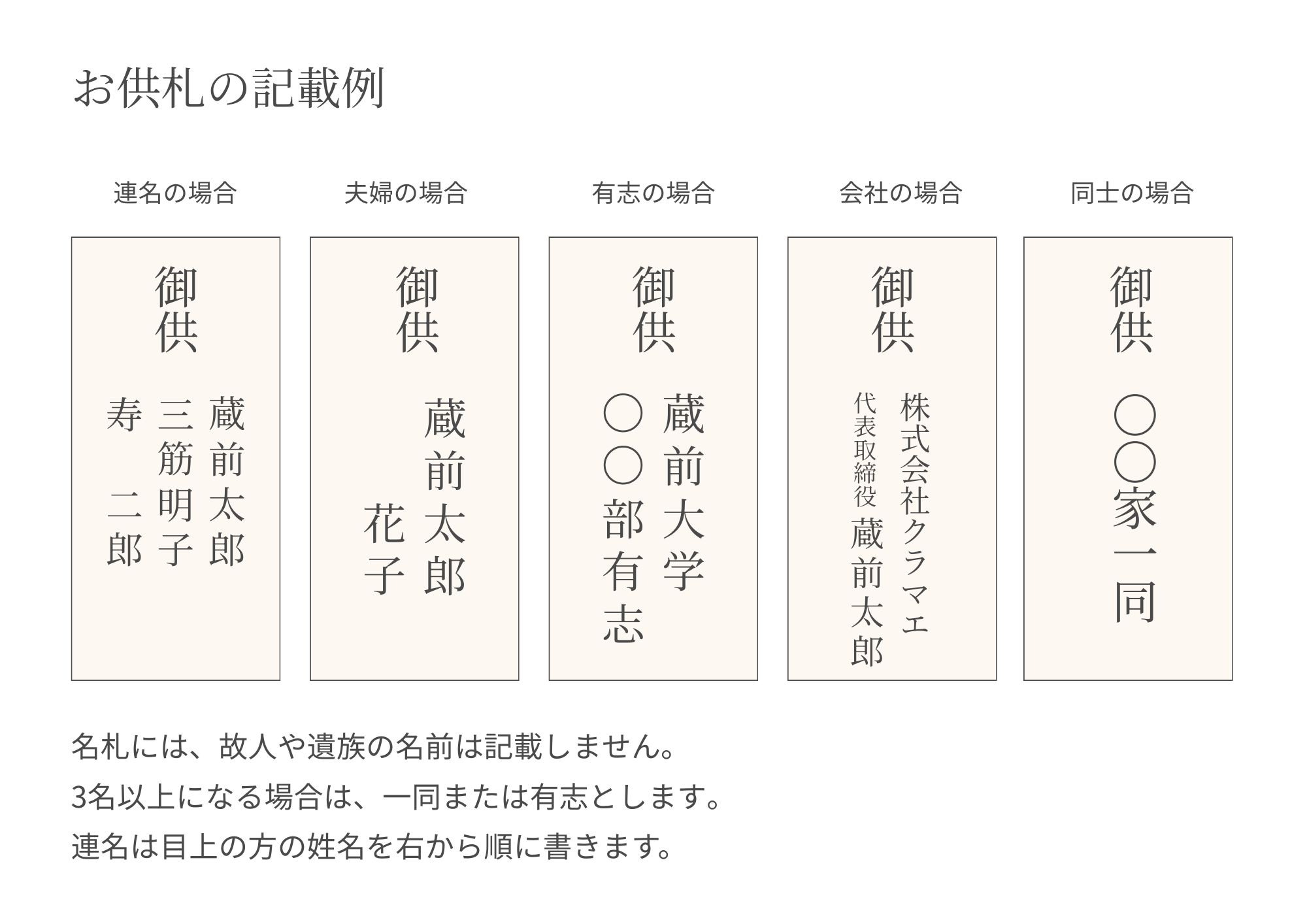 お供えの場合は、贈り主のお名前を記載します。故人や遺族のお名前は記載しません。連名の場合は、目上の方のお名前を右から順に書くのがマナーです。3名以上の場合は「一同」または「有志」とします。