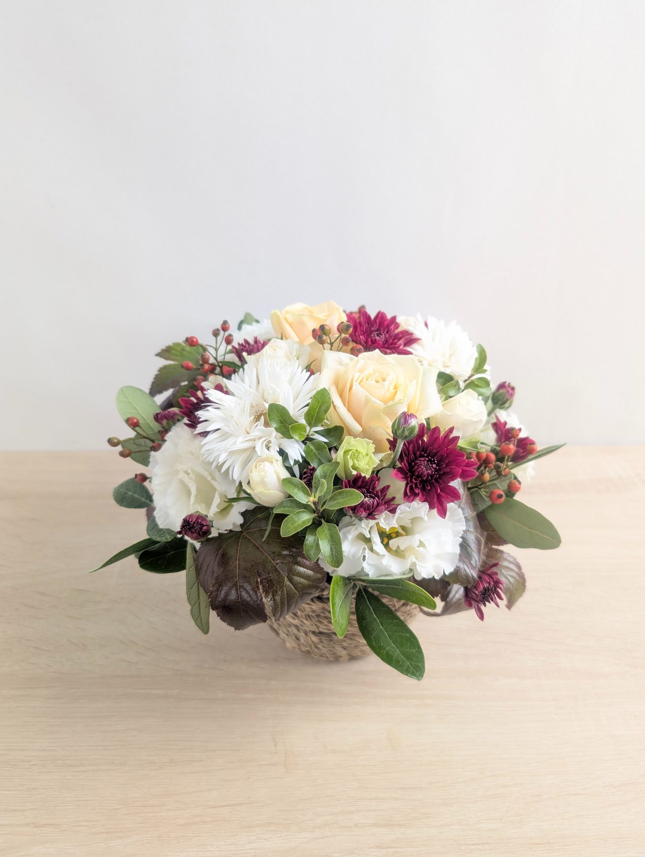 最近では、秋らしい実物や紅葉した葉物、秋バラやマムなど季節のお花を入れたアレンジメントをお届けしました。