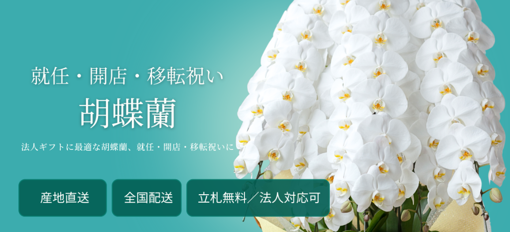 胡蝶蘭が定番。花持ちがよく「繁栄」を象徴するため、ビジネスシーンで必ず喜ばれます。