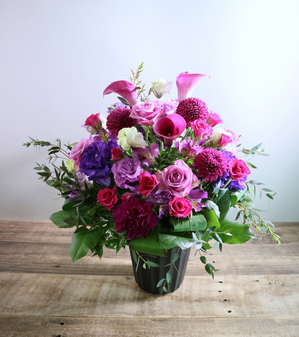WEB上のアレンジや花束の画像がどれも素敵で、ぜひ父の叙勲祝いに送りたくお願いしました。お花の色を迷いましたが、叙勲のお祝いらしく、華やかかつ上品なアレンジにしていただき、パープル系でお願いしてよかったと感謝しています。父にもとても喜んでもらえたようです。