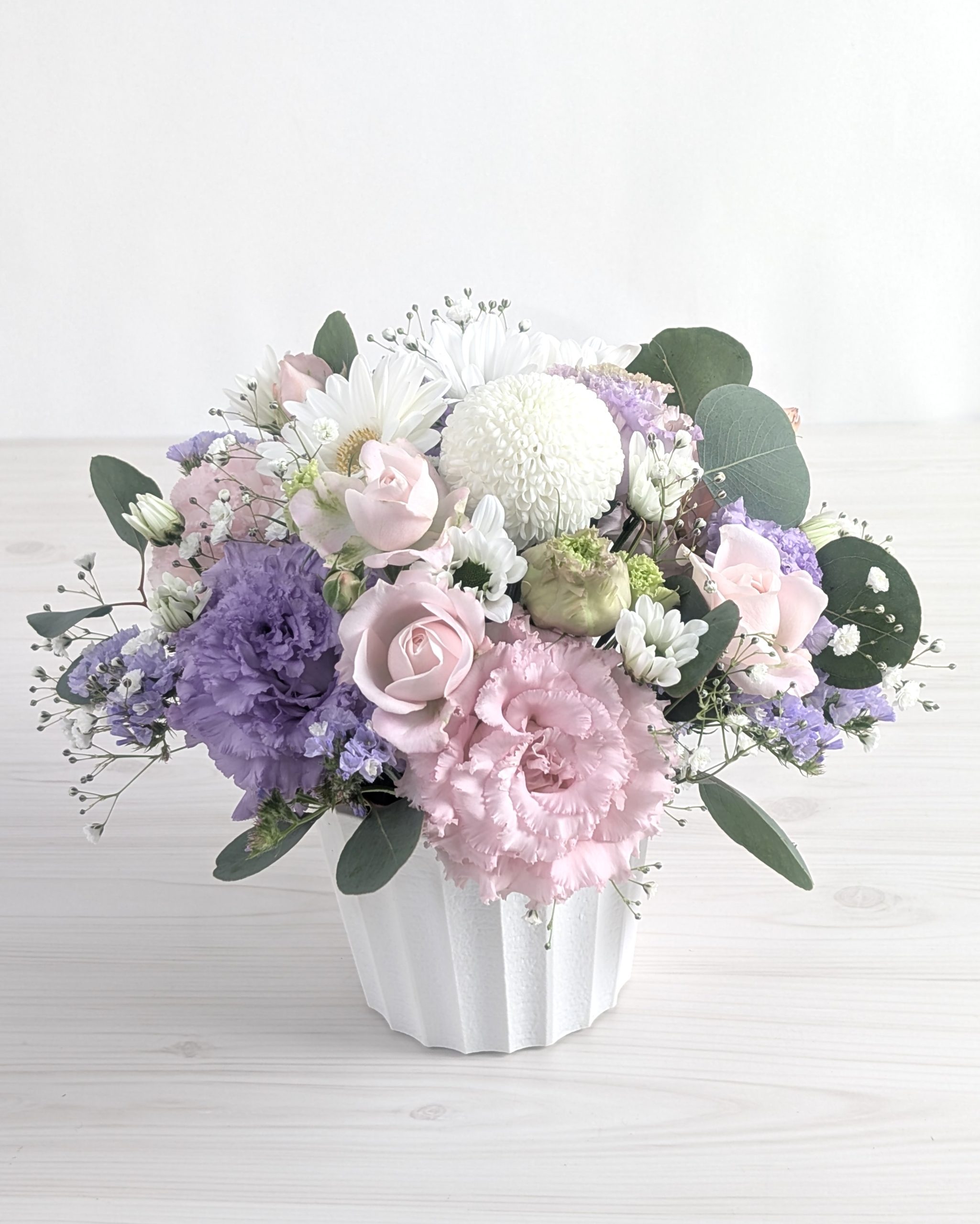 お花の色は基本的には白ですが、 五十日祭は「忌明け」のお祝い(故人が家の守護神となる儀式)という側面もあるため、白一色ではなく、淡いピンクや黄色、紫などを混ぜて少し明るく仕立てるのが一般的です。神道では特に「この花でなければならない」という厳格な決まりはありません。一般的なお供えの花であれば、贈ることができます。